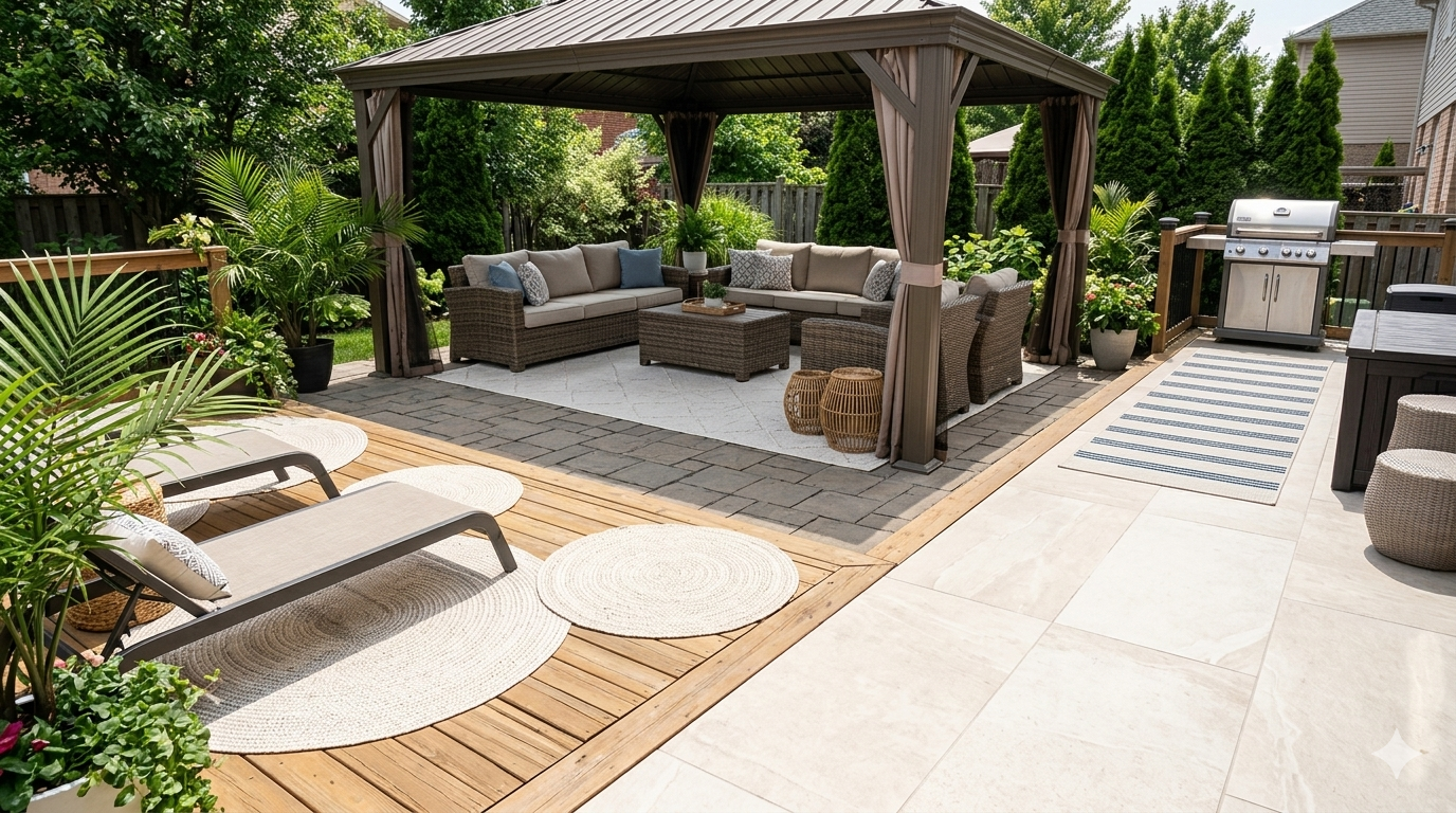 • Textured woven rugs — bringing tactile richness to outdoor flooring