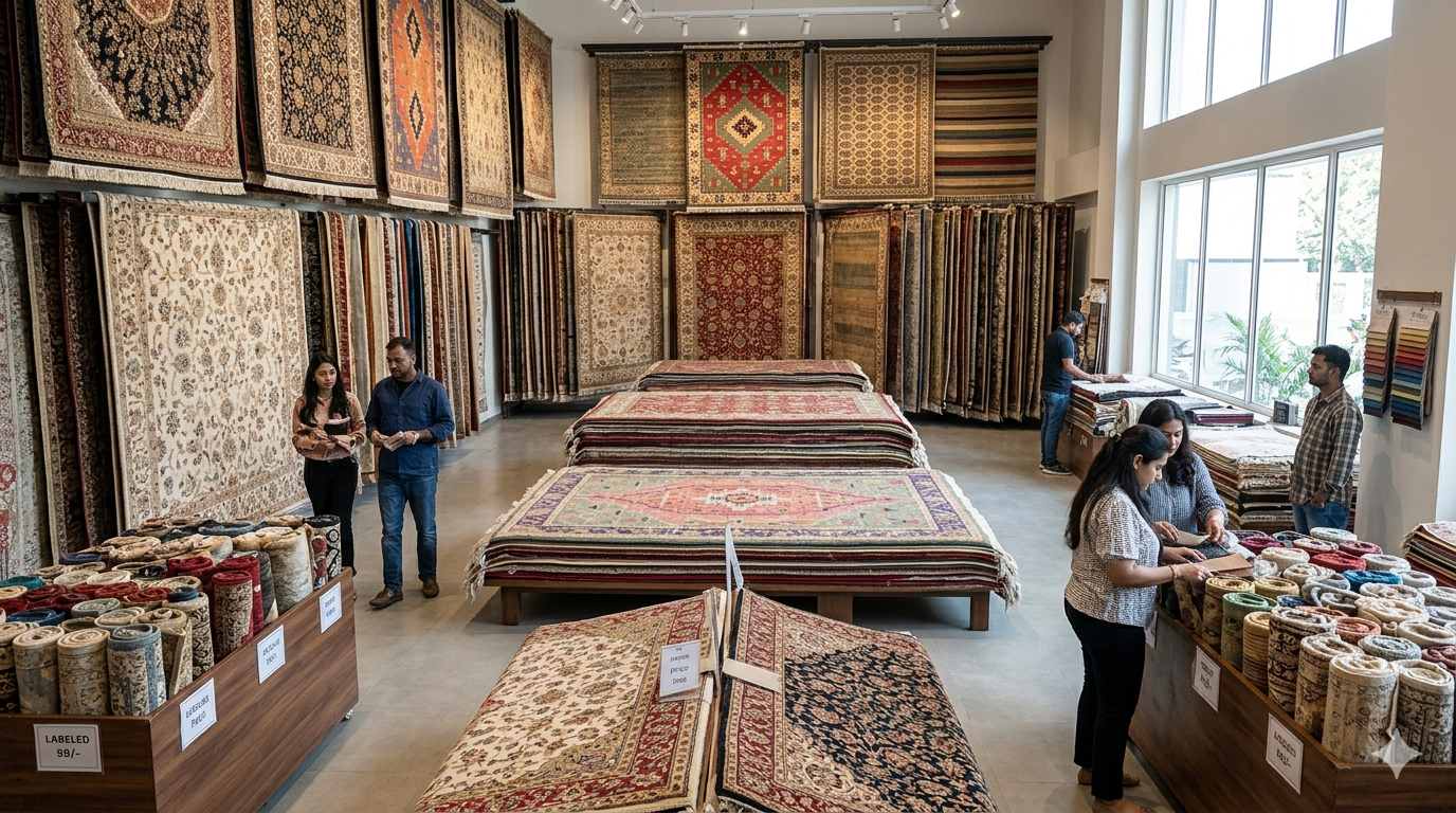 For luxury villas, we recommend our premium wool or traditional ethnic rugs. For corporate offices, our durable modern and contemporary synthetic blends work best for high traffic.