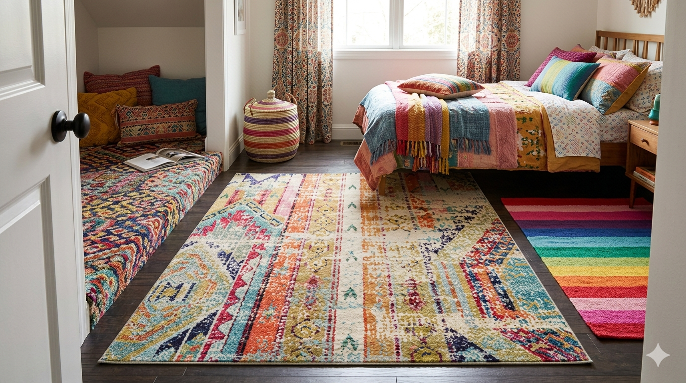 Bedrooms benefit from soft textures and muted tones. A gently faded vintage rug provides a warm, comforting surface for bare feet. You can also layer a smaller vintage piece over a larger sisal or jute rug for a cozy, textured look.